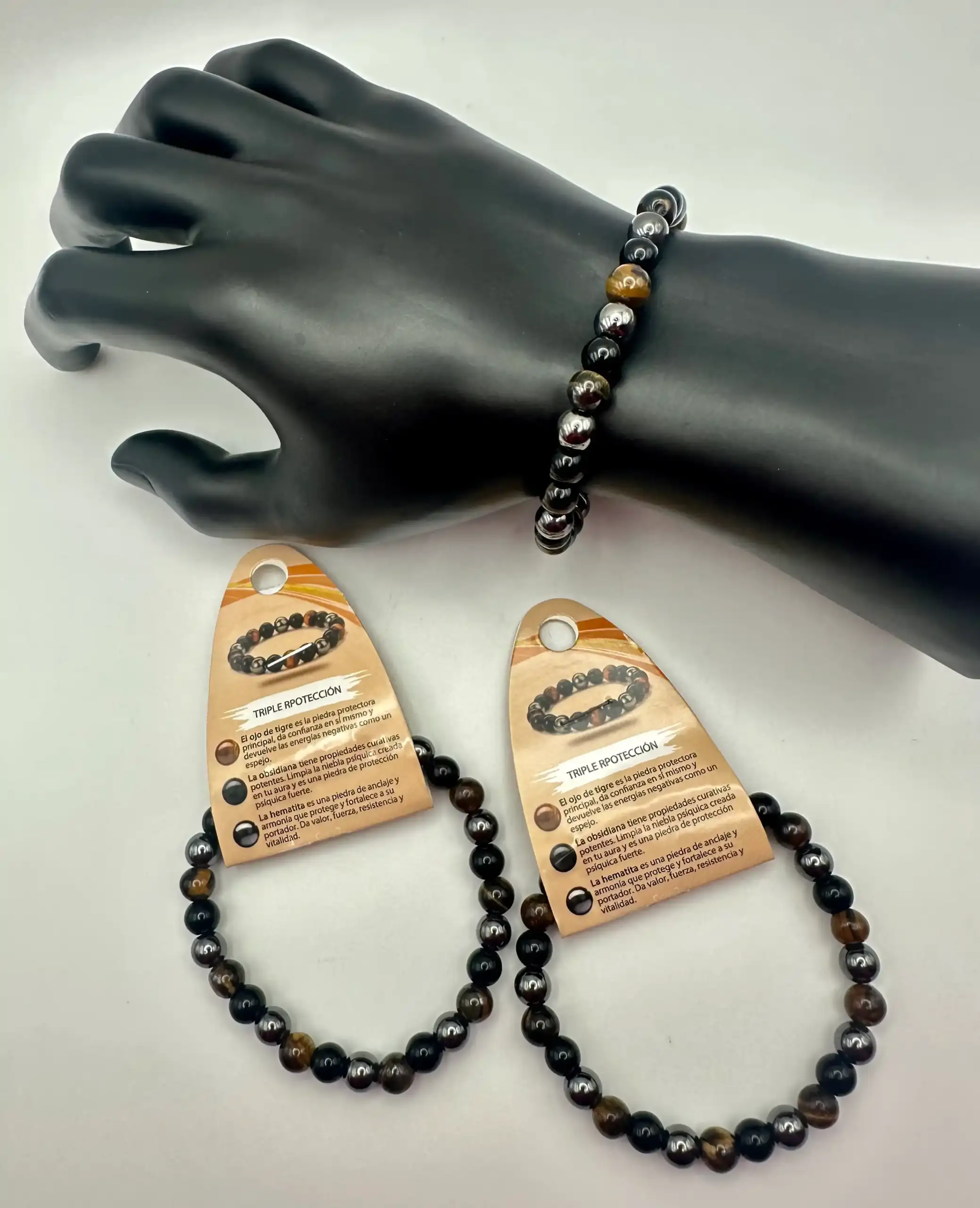 Esta pulsera es muy poderosa, aporta una gran protección al combinar estos 3 minerales: Hematite, Ojo de Tigre y Obsidiana.