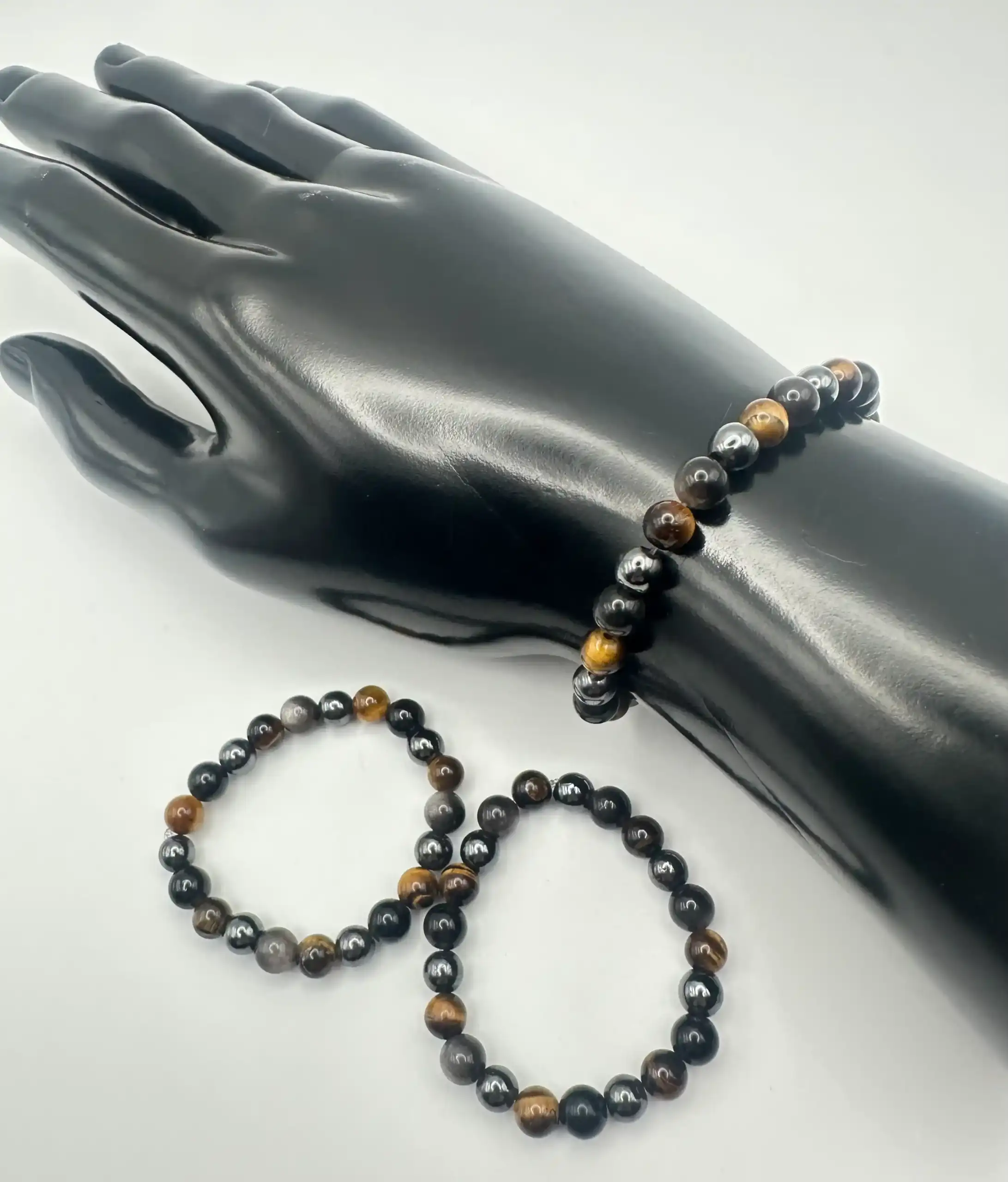 Pulsera infantil de minerales naturales, diseñada para acompañar y proteger a los más pequeños. Combina ojo de tigre, que aporta confianza y valentía; hematite, asociada al equilibrio y la calma; y turmalina, conocida por su efecto protector. Es ligera y cómoda, ideal para el uso diario de los niños.