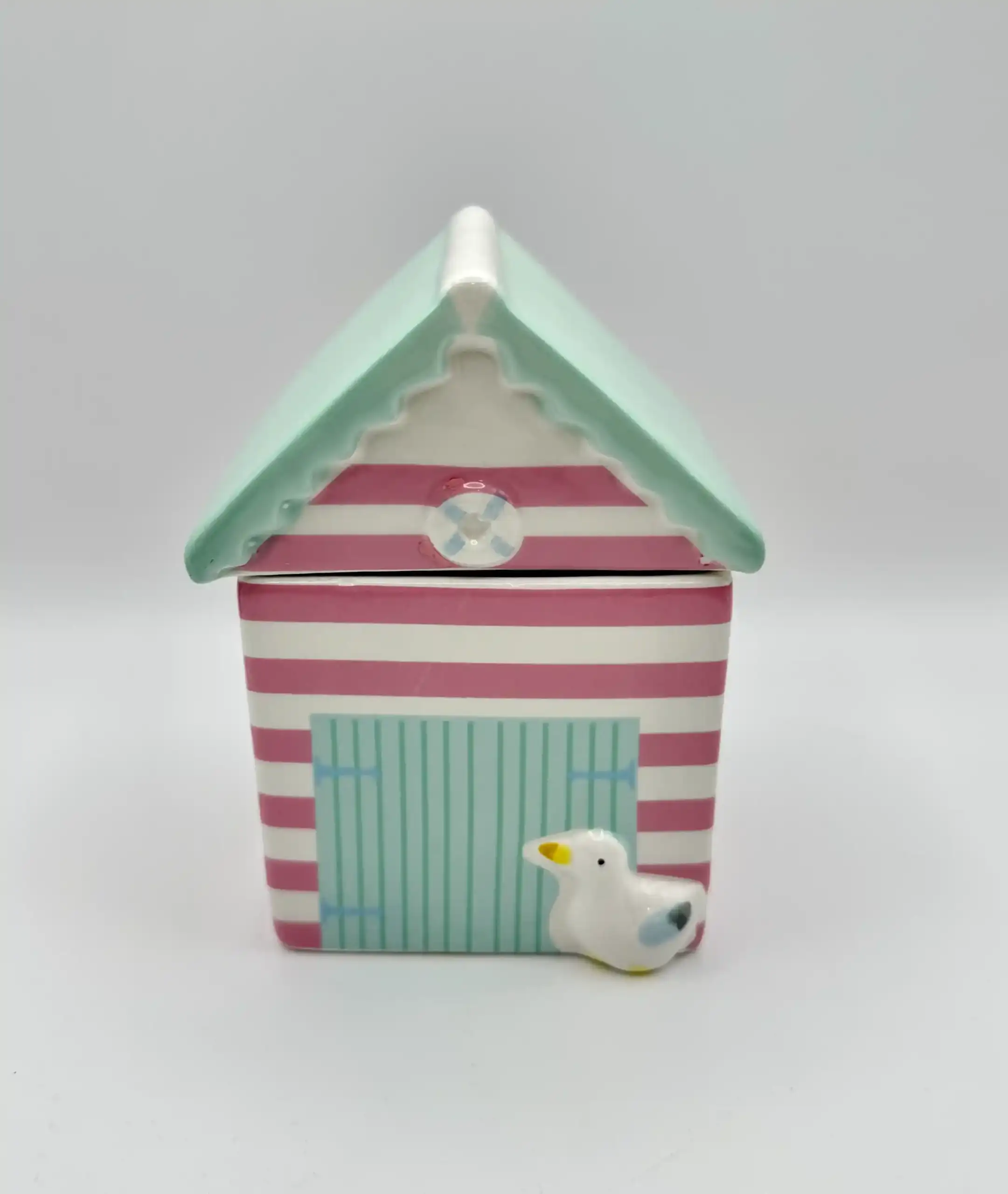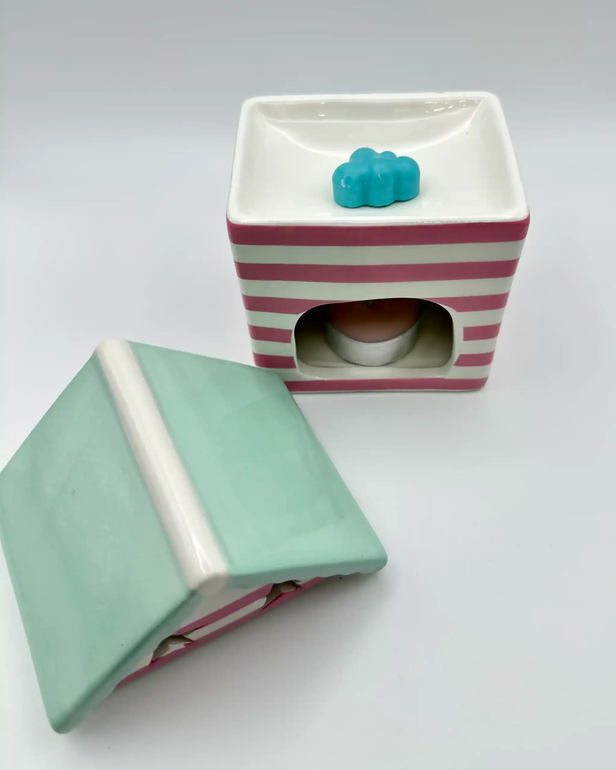 Quemador de olor con forma de caseta de playa en tonos pasteles. Compatible con ceras aromáticas y aceites.