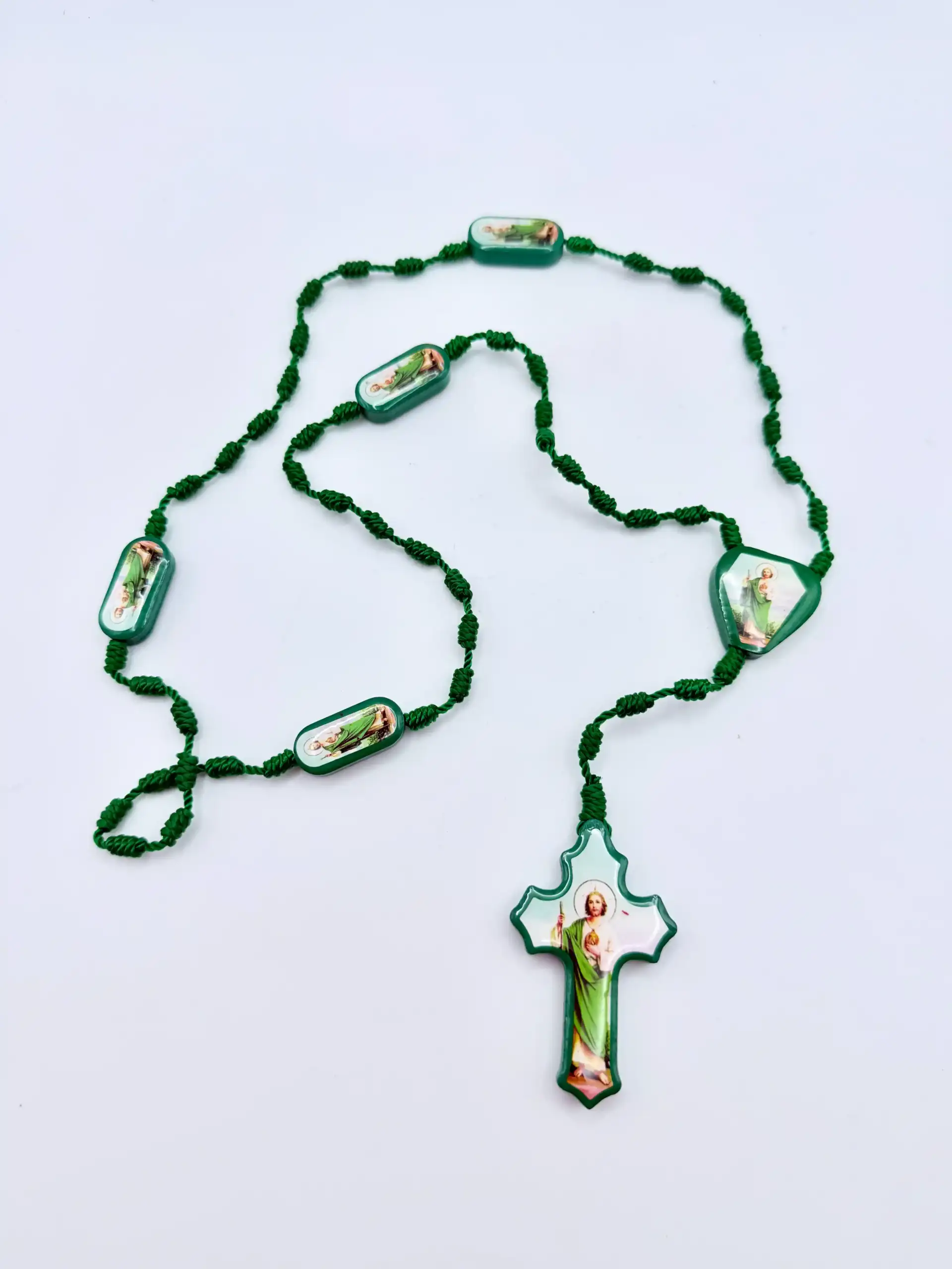Rosario plastico verde brillante con cruz e imagenes de San Judas Tadeo.