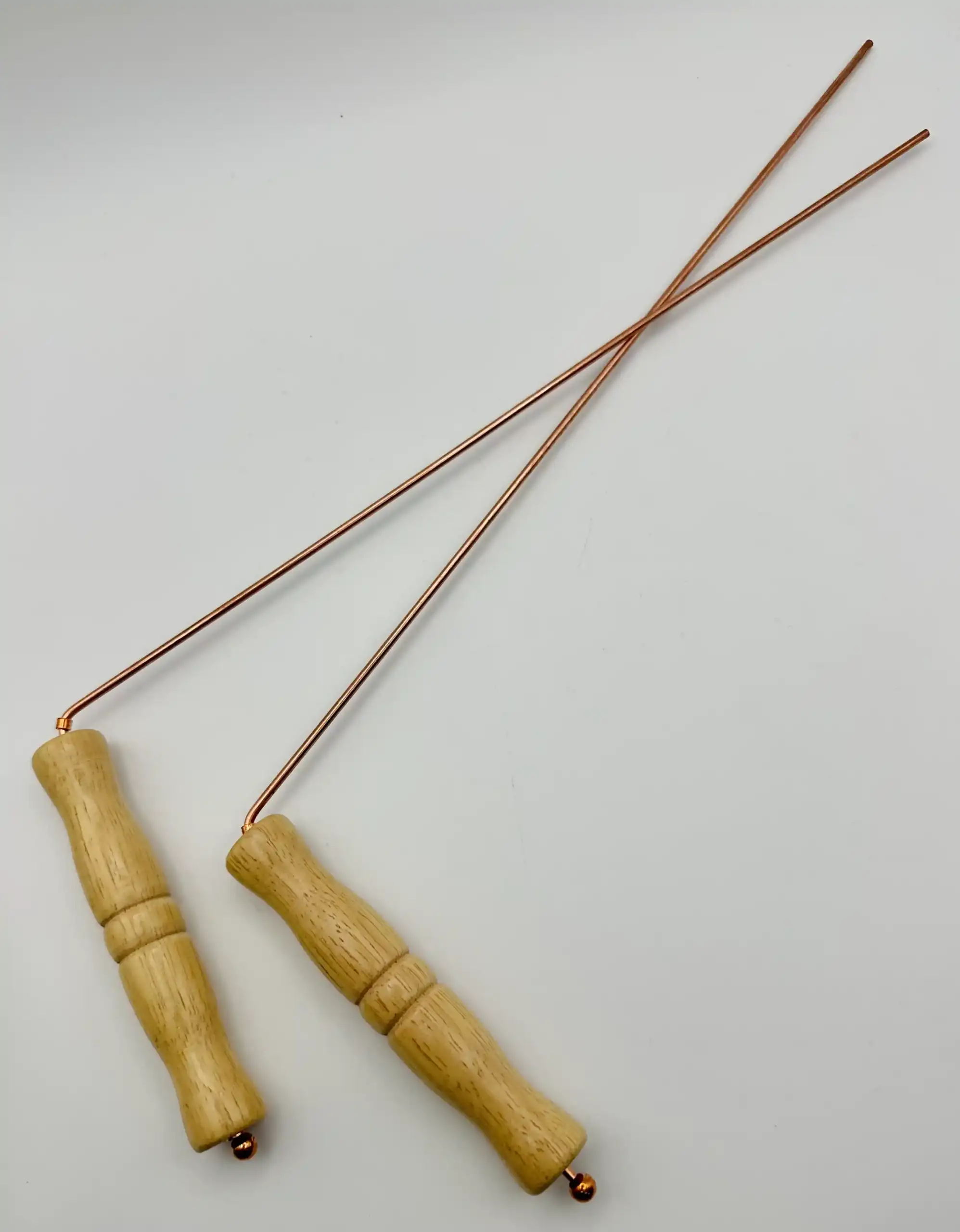Varillas de cobre con puños en madera. Las varillas de radiestesia se emplean para detectar energías sutiles, como bloqueos energéticos en personas o espacios, y para comprobar el estado de los chakras y el aura. También son herramientas de apoyo en limpiezas energéticas, rituales de protección, y para favorecer la conexión con la intuición o guías espirituales.