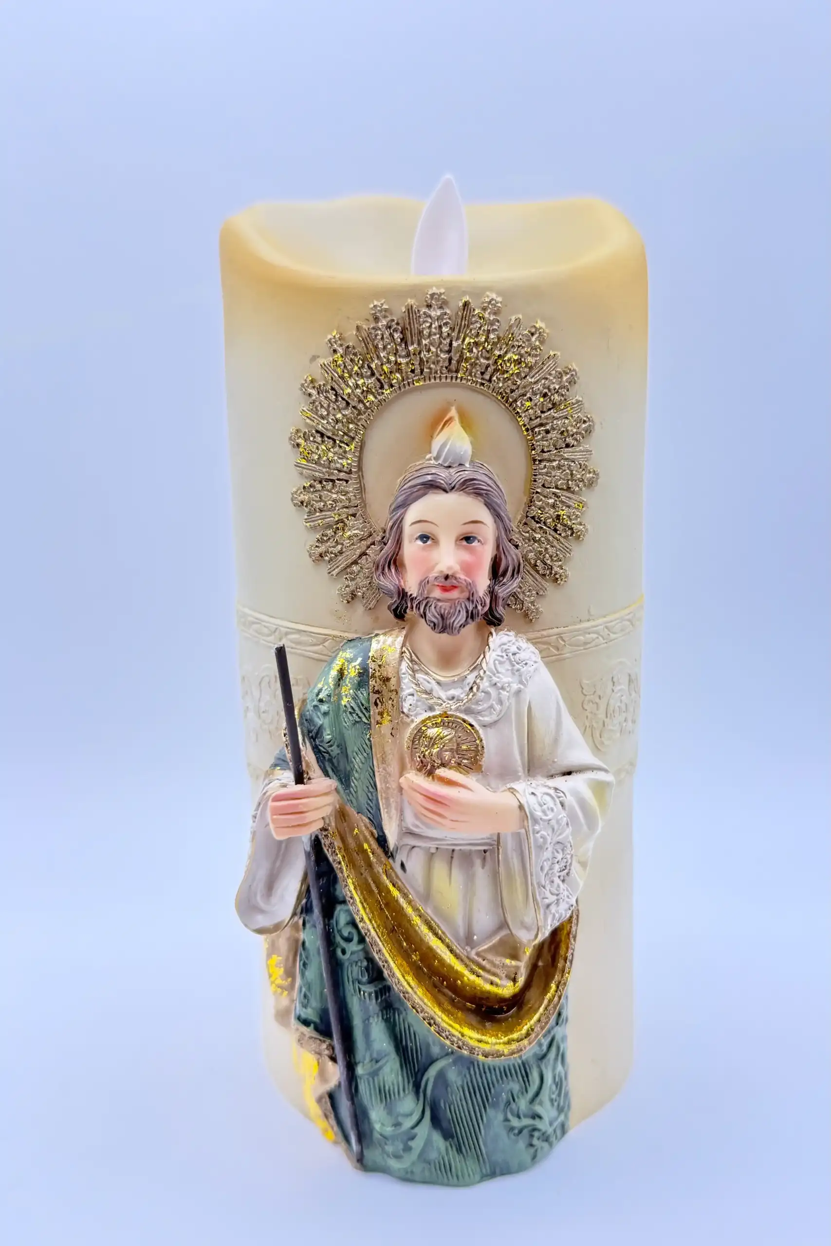 Lámpara en forma de vela con San Judas Tadeo, funciona con pilas y la llama se mueve. San Judas Tadeo gira en torno a su patronazgo de las causas difíciles y desesperadas, simbolizando esperanza, protección y fortaleza ante la adversidad. Los fieles recurren a su intercesión en momentos de gran necesidad, pidiendo ayuda para superar obstáculos, encontrar soluciones y recibir consuelo y protección divina. Su figura también representa la resiliencia y la fe en el amor de Dios para transformar situaciones imposibles en oportunidades de crecimiento espiritual.