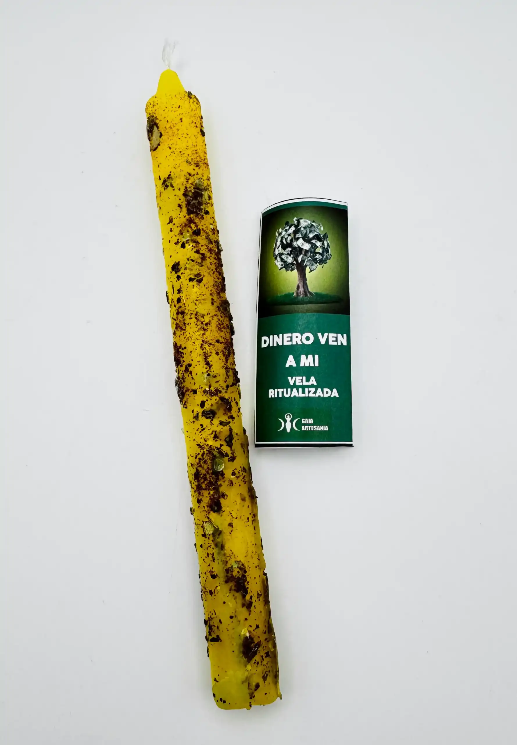 Vela ritualizada para atraer abundancia económica. Su función principal es atraer prosperidad y riqueza a través de la llama de la vela, ya sea mediante un ritual específico o simplemente al encenderla con la intención correcta. Por lo general se usan velas amarillas o doradas para simbolizar el dinero, el éxito y la prosperidad.