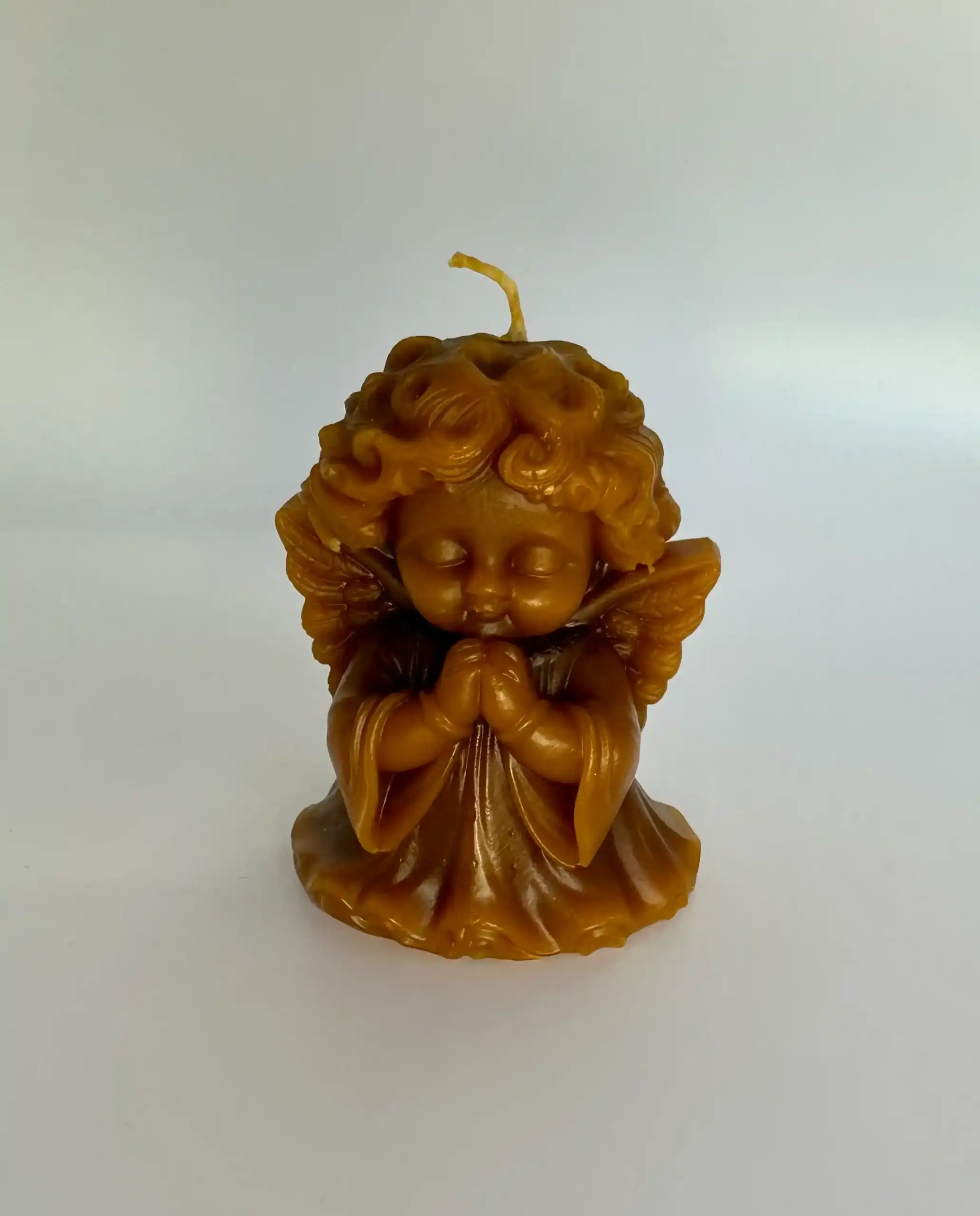 Vela de miel con forma de angelito, los ángeles son seres celestiales benevolentes que actúan como intermediarios entre Dios y la humanidad.