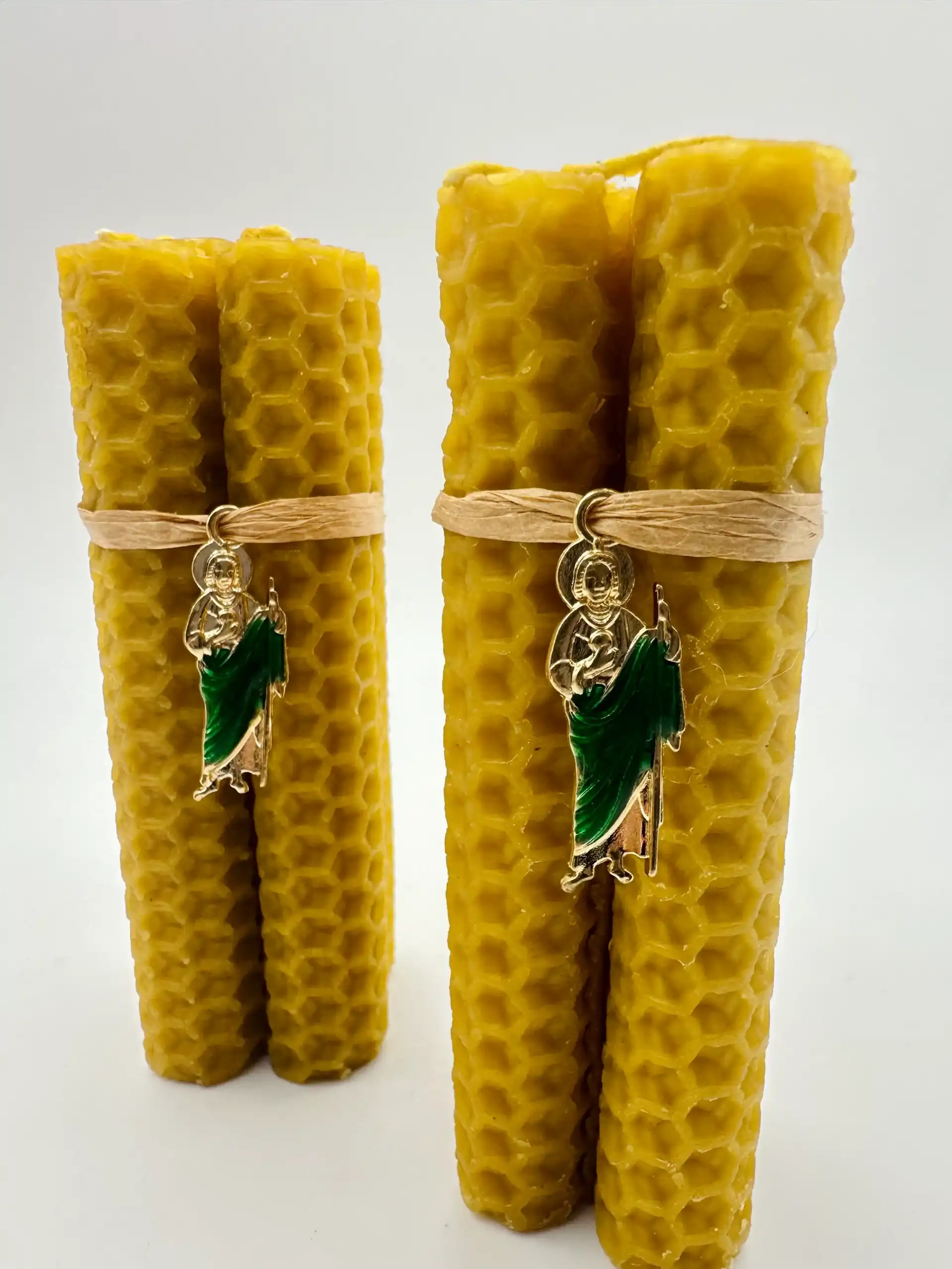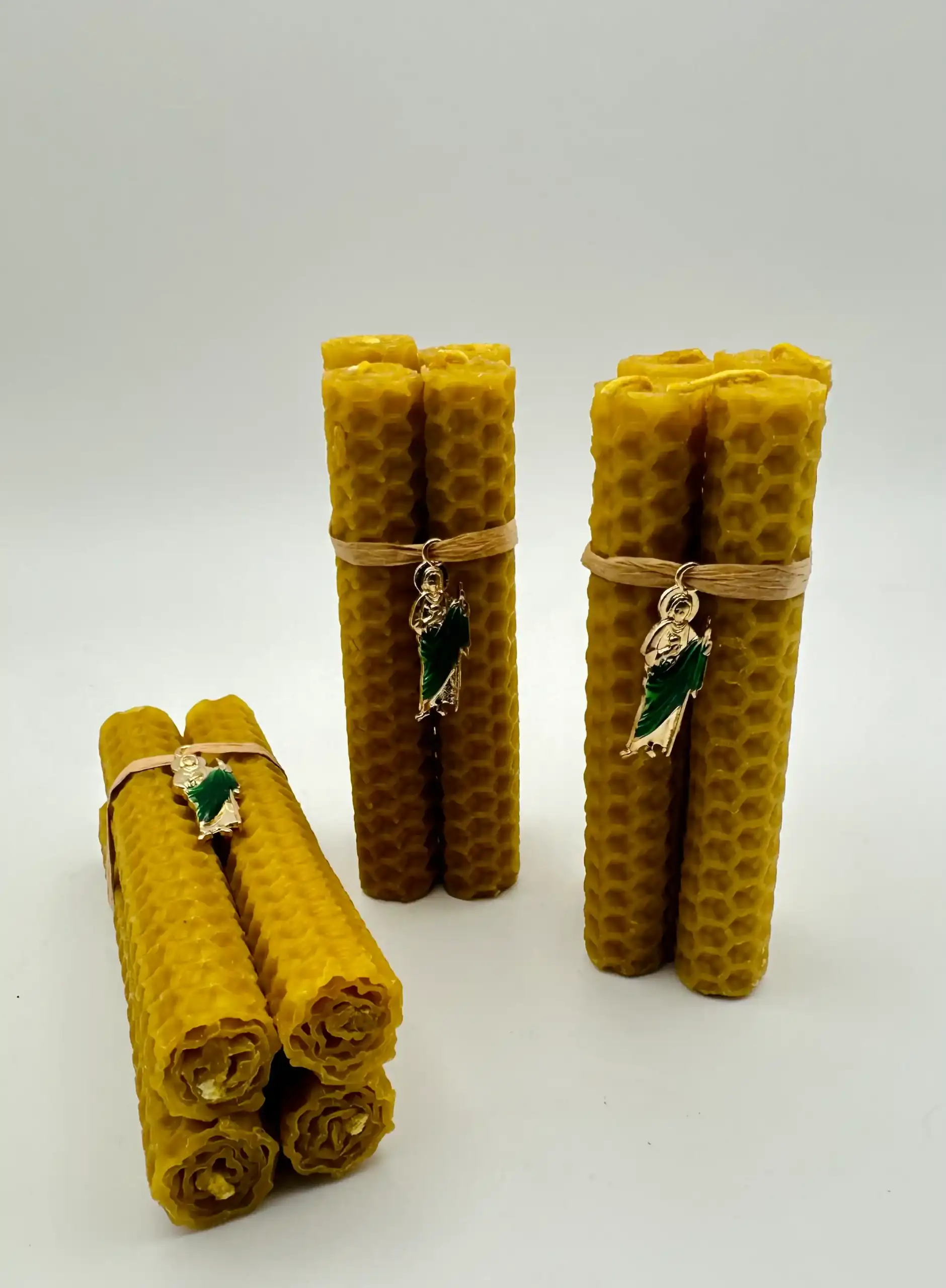 Pack de 4 velas de miel con amuleto de San Judas Tadeo en acero dorado. San Judas Tadeo es el patrón de las causas imposibles y desesperadas, un símbolo de esperanza, fortaleza y resiliencia ante las adversidades. Conocido como el santo de las causas perdidas, se le invoca en momentos de gran necesidad, buscando su protección y consuelo, y su imagen se asocia con la intercesión continua y la ayuda divina.