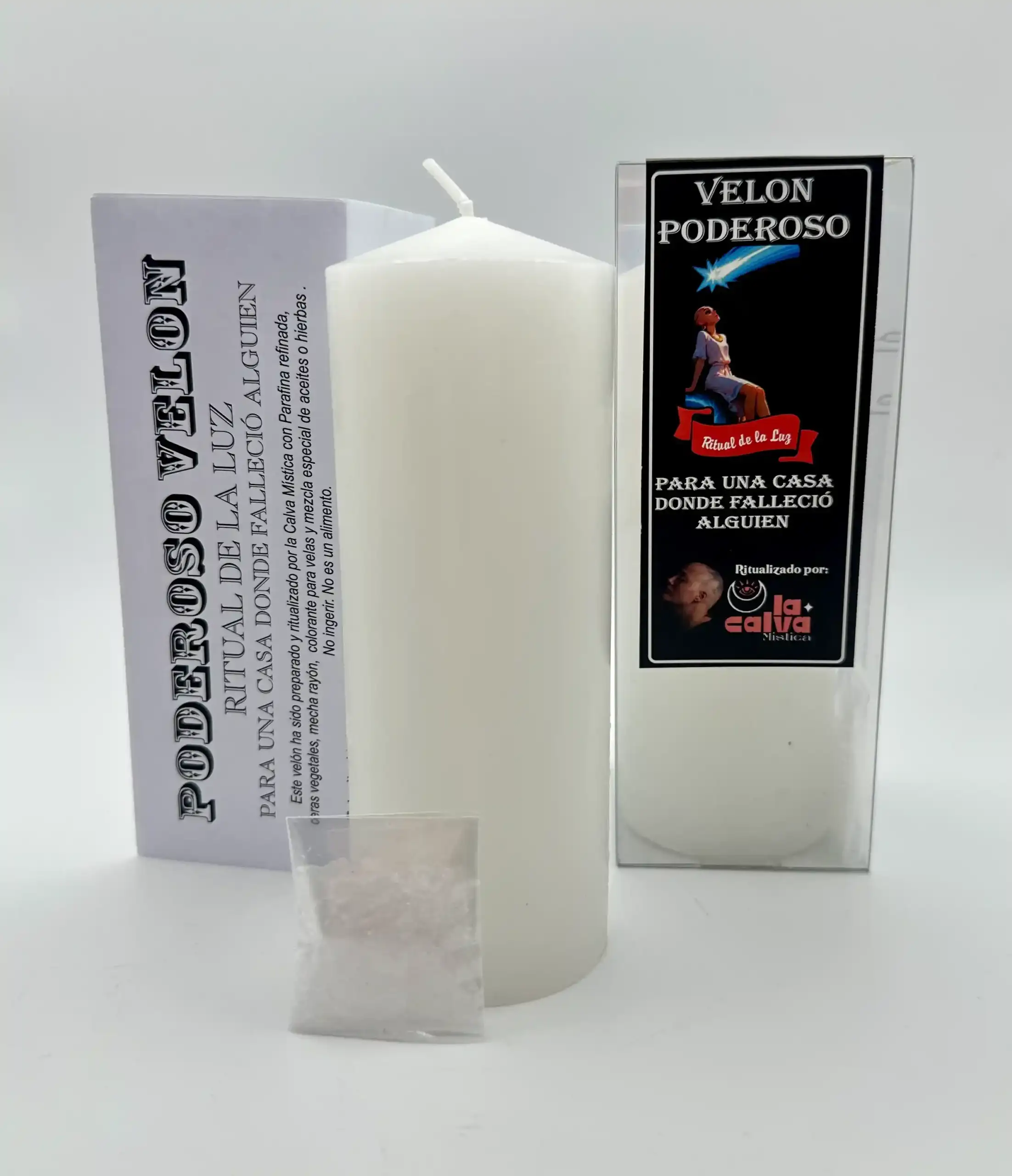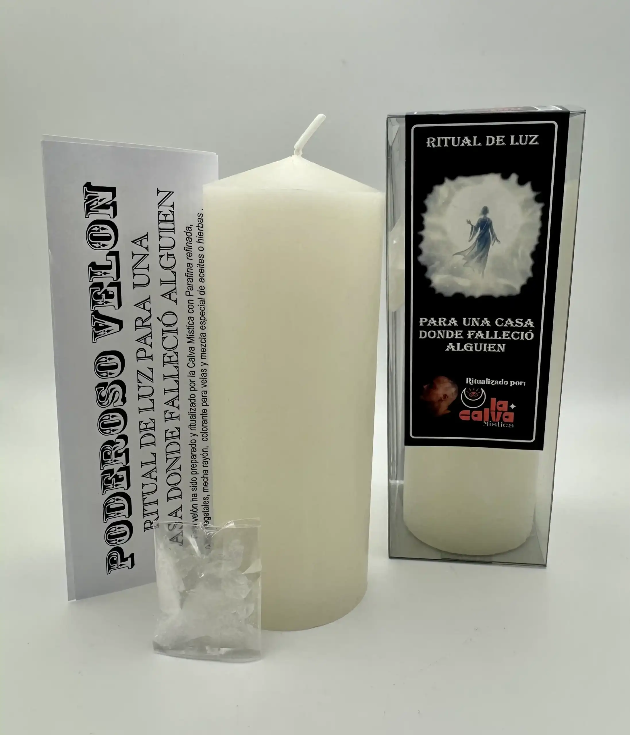 Este velón ha sido preparado y ritualizado por La Calva Mística para ayudar a cruzar a la luz a quien ha fallecido en casa y sigue allí.