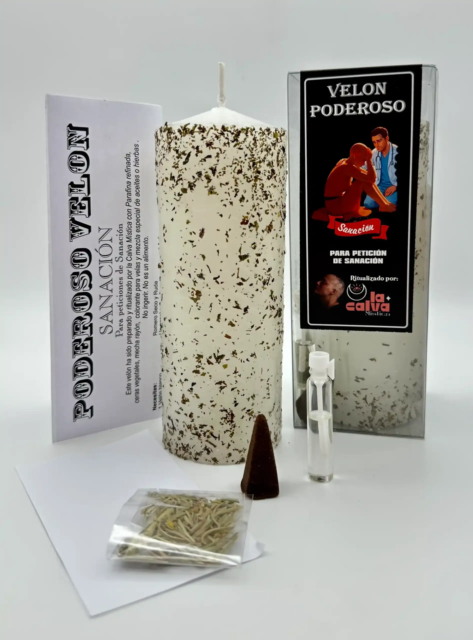 Este poderoso velón ha sido creado especialmente para sanarnos. Una sanación profunda que todos en algún momento de la vida necesitamos. El ritual contiene una bolsita de romero, un aceite y un cono de incienso para que el ritual sea lo más completo posible.