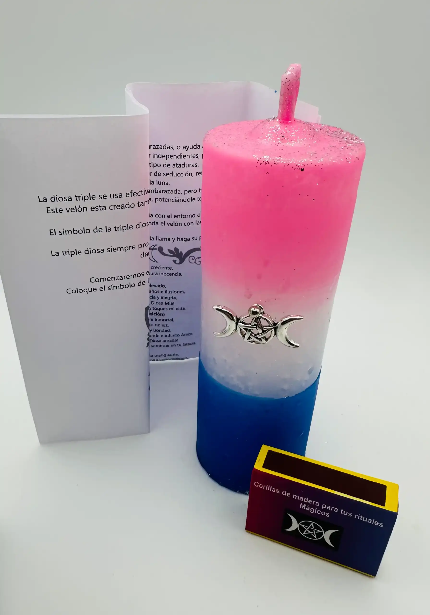 El velon preparado a la triple diosa se usa para la protección de mujeres embarazadas, o ayuda a que las mujeres queden embarazadas. Este velón esta creado también para la feminidad de la mujer, para ser independientes, para realizar y alcanzar sus metas y lograr vivir en libertad sin ningún tipo de ataduras. El símbolo de la triple diosa, con sus tres lunas, otorga fertilidad, poder de seducción, refuerza la intuición y los poderes psíquicos en conexión con la luna.